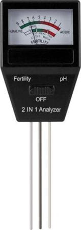 Ein Gerät zur gleichzeitigen Messung des pH-Werts und der Bodenfruchtbarkeit. Die Sensoren befinden sich am Ende der Spikes. Die Ablesung erfolgt über eine Skala im Kunststoffgehäuse. Das Gerät ist mit einer 1,5 V AA-Batterie ausgestattet.