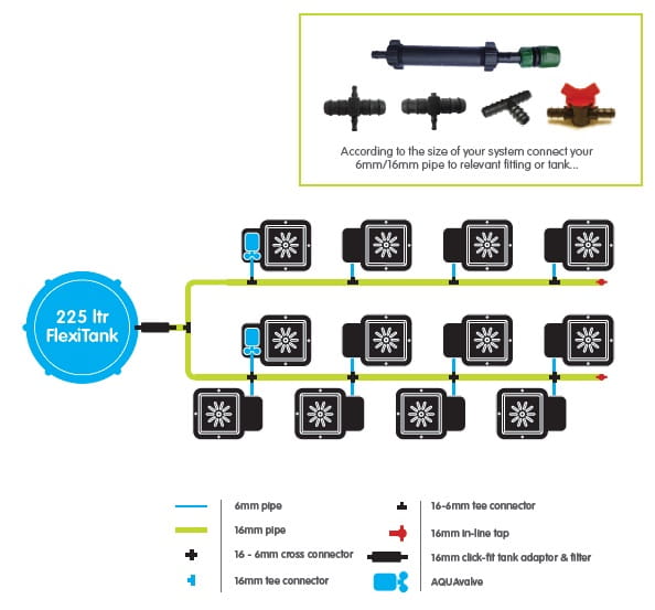 Der Hersteller empfiehlt bei Anlagen mit 1-7 Töpfen Zulaufschläuche Medium mit einem Durchmesser von 6 mm zu verwenden. Bei mehr als 8 Töpfen empfiehlt sich die Verwendung eines 16 mm dicken Schlauchs. Je mehr Töpfe in einem Set vorhanden sind, desto größer sollte der Haupttank sein.