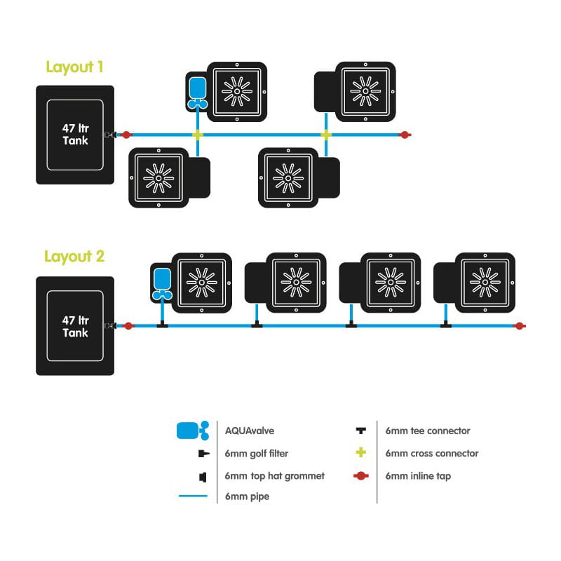 Der Hersteller empfiehlt bei Anlagen mit 1-7 Töpfen Zulaufschläuche Medium mit einem Durchmesser von 6 mm zu verwenden. Bei mehr als 8 Töpfen empfiehlt sich die Verwendung eines 16 mm dicken Schlauchs. Je mehr Töpfe in einem Set vorhanden sind, desto größer sollte der Haupttank sein.