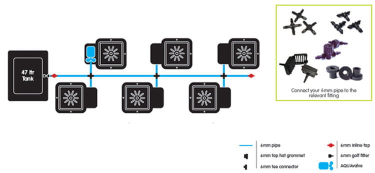 Der Hersteller empfiehlt bei Anlagen mit 1-7 Töpfen Zulaufschläuche Medium mit einem Durchmesser von 6 mm zu verwenden. Bei mehr als 8 Töpfen empfiehlt sich die Verwendung eines 16 mm dicken Schlauchs. Je mehr Töpfe in einem Set vorhanden sind, desto größer sollte der Haupttank sein.
