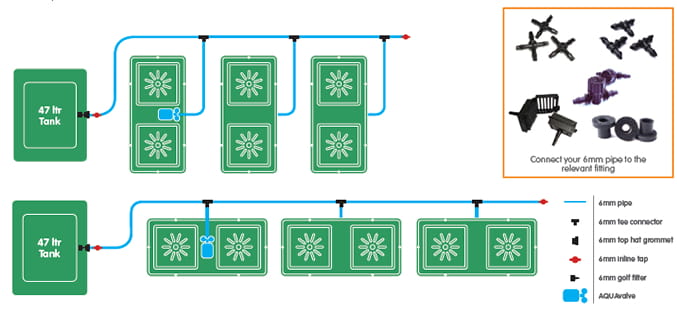 Der Hersteller empfiehlt bei Anlagen mit 1-7 Töpfen Zulaufschläuche Medium mit einem Durchmesser von 6 mm zu verwenden. Bei mehr als 8 Töpfen empfiehlt sich die Verwendung eines 16 mm dicken Schlauchs. Je mehr Töpfe in einem Set vorhanden sind, desto größer sollte der Haupttank sein.
