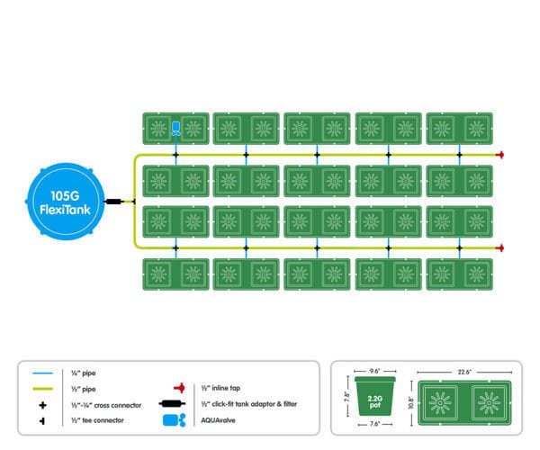 Der Hersteller empfiehlt die Verwendung von Nährstoffversorgungsschläuchen mit 6 mm Durchmesser in Systemen mit 1–7 Töpfen. Bei mehr als 8 Töpfen empfiehlt sich die Verwendung eines 16 mm dicken Schlauchs. Je mehr Töpfe in einem Set vorhanden sind, desto größer sollte der Haupttank sein.