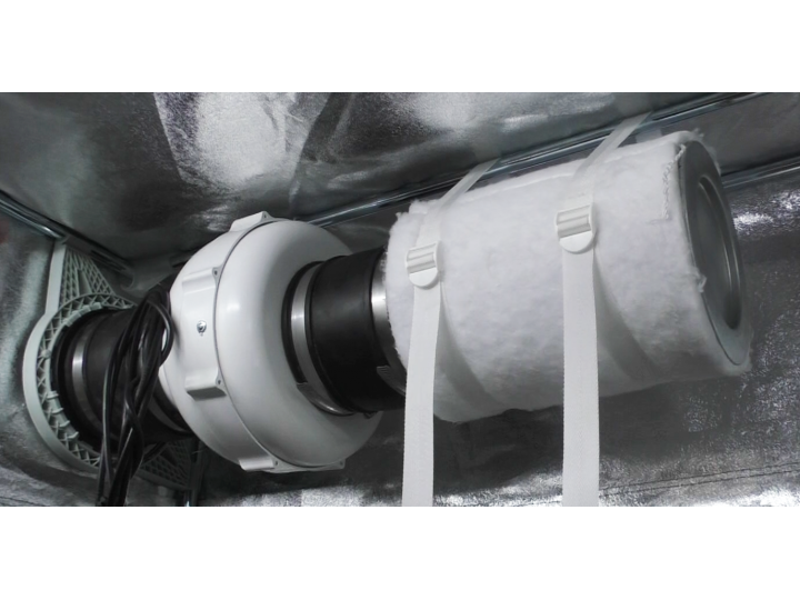 Gummi-Lüftungskanal Ø 125 mm, der den Abluftventilator mit dem Anti-Geruchsfilter verbindet. Die Verbindung ist flexibel und sehr dicht.