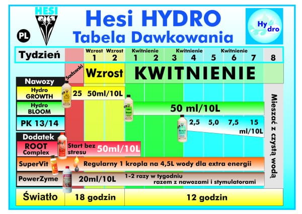 Während der Blütezeit Pflanzen haben einen erhöhten Bedarf an Phosphor und Kalium und durch die Verwendung von PK 13/14 decken wir diesen Bedarf vollständig. Die Blütezeit ist die wichtigste Phase im Leben der Pflanze. Der Stoffwechsel läuft dann auf Hochtouren und es werden Unmengen an Blühenzymen produziert. Außerdem wird die Pflanze größer, sodass sie mehr Inhaltsstoffe benötigt. Die für das Wachstum der Pflanze verantwortlichen Stoffe sind Phosphor (Enzyme und Erbanlagen) und Kalium (für den Transport innerhalb der Pflanze). Damit die Pflanze nicht unnötig oder zu früh mit Salz belastet wird, wird Hesi PK 13/14 eingesetzt sollte in der zweiten Blütehälfte bis eine Woche vor dem Ende des Zyklus verwendet werden. In den letzten Wochen der Blütezeit sollten schrittweise höhere Dosen ausgebracht werden. PK 13/14 ist (nach Kokosanbautabelle oder Wasser) auf Hesi Hydro Bloo und Hesi Coco abgestimmt.