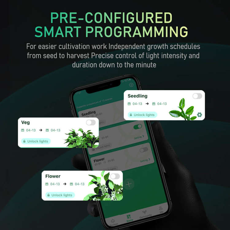 Mars Hydro Smart Grow System strong> – intelligente LED-Wachstumslampen, die die mobile Steuerung und Programmierung über die Mars Hydro-App unterstützen. Konfigurieren Sie die Intensität präzise bis auf Monat/Tag/Stunde/Minute für dynamische Lichtstärken und simulierten Sonnenaufgang und Sonnenuntergang, um die natürliche Photoperiode der Pflanzen nachzuahmen.