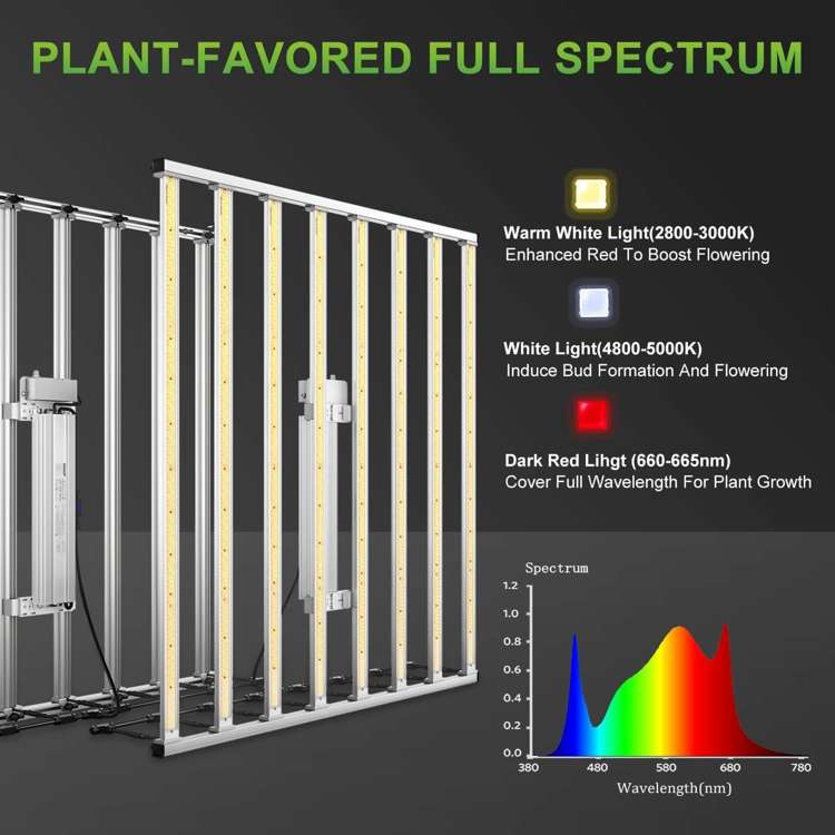Vollspektrum-Wachstumsbeleuchtung – mit maximalem Ertragsspektrum (660–665 nm, 2800 K). -3000k, 4800-5000k) , die hauptsächlich im PAR-Bereich (400-700 nm) liegt, aktiviert die LED-Beleuchtung FC-E8000 die Photosynthese und liefert genügend Licht, damit Pflanzen stärker und gesünder wachsen.