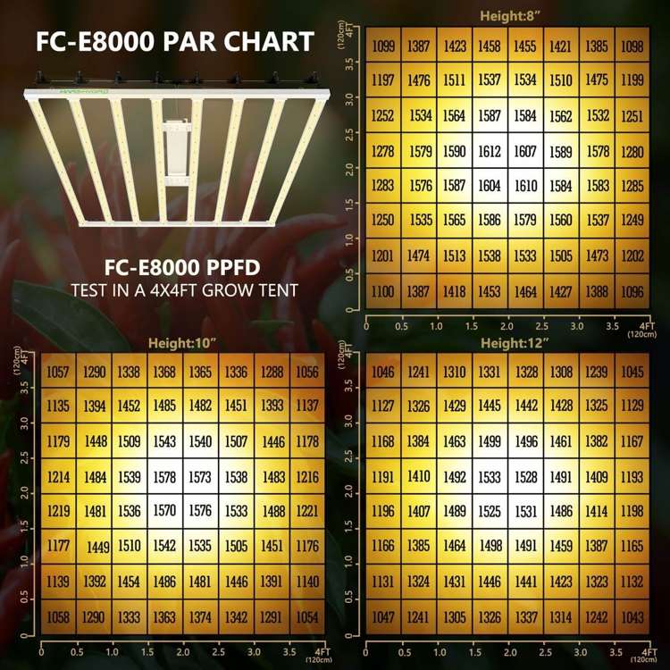 Hochleistungs-LED-Wachstumslampen strong> - Die Wachstumslampe FC-E8000 ist mit hochwertigen BridgeLux-Dioden ausgestattet, die einen marktführenden Wirkungsgrad von 2,8 µmol/J bieten. Verbraucht 730 Watt mit einem um 30 % höheren durchschnittlichen PPFD als andere Lampen mit der gleichen Wattzahl, sorgt für eine bessere Erntequalität und höhere Kosteneffizienz und senkt Ihre Stromrechnung um 50 % als HID/HPS-Lampen! *Passt am besten zu einem 150 x 150 cm großen Grow-Zelt, Vertical Farming, kommerziellen Rolltisch-Aufbauten und kommerziellen Indoor-Grow-Räumen.
