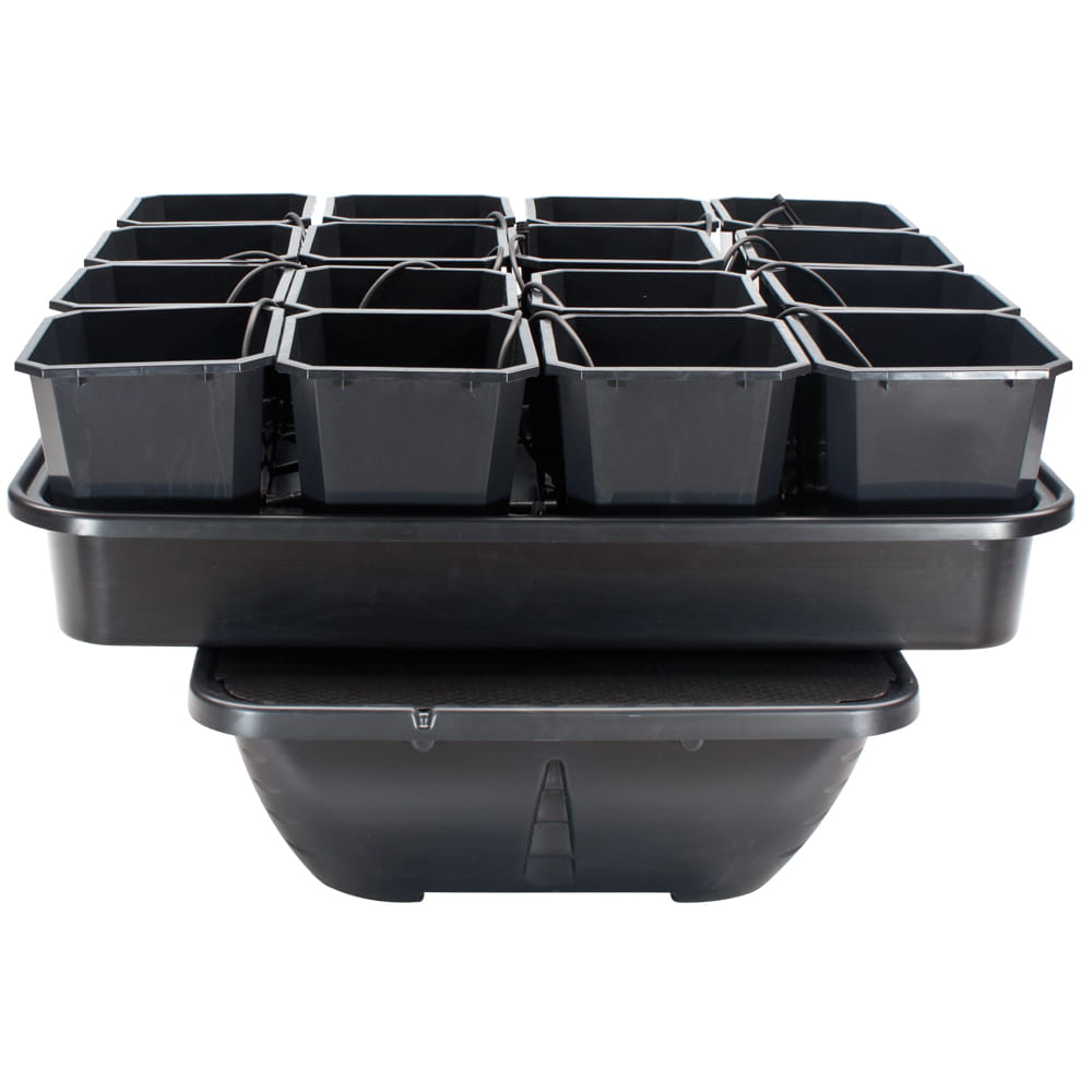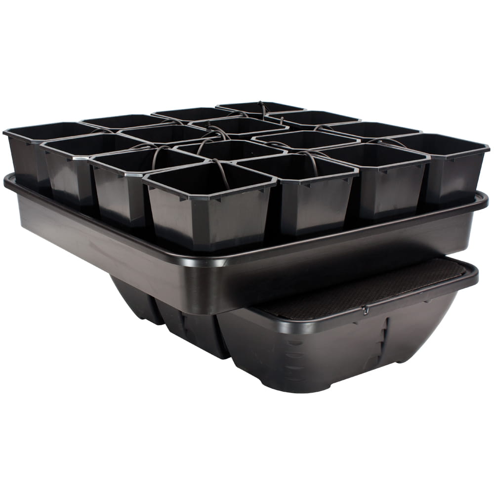 Komplettes professionelles PLANT!T ATLAS Hydrokultur-Set für 16 Pflanzen. Basierend auf 12-Liter-Töpfen. Bewässerung ist die häufigste Methode des Hydrokulturanbaus. Wenig Nährstoffe und Substrat gepaart mit häufiger Bewässerung sorgen für eine optimale Feuchtigkeit der Pflanzen im Substrat. Dies führt zu gesünderen Pflanzen und höheren Erträgen als bei gelegentlichem häufigem Gießen von Hand.