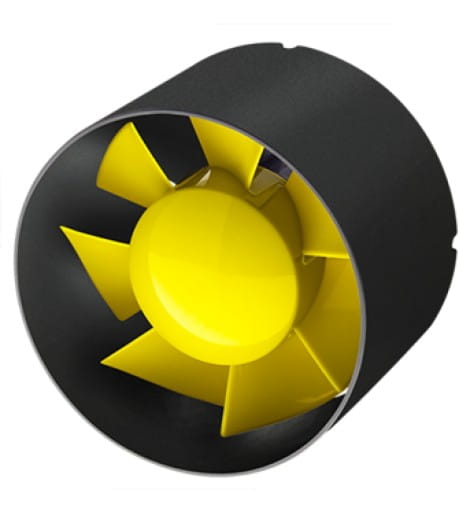 Massiv gefertigter, axialer Rohrventilator für Lüftungsanlagen mit einem Durchmesser von 125 mm.