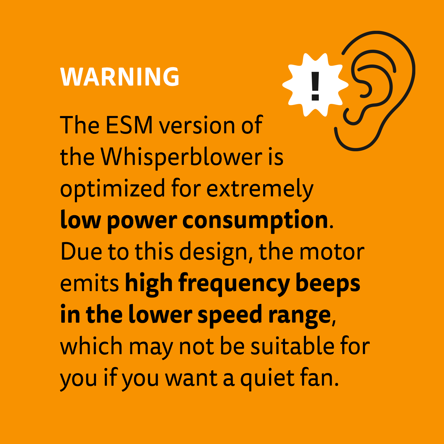 Die Whisperblower 360-460 M3/H ESM-Version ist für einen extrem niedrigen Energieverbrauch optimiert. Aufgrund dieser Konstruktion gibt der Motor im unteren Drehzahlbereich hochfrequente Tonsignale ab, die möglicherweise nicht geeignet sind, wenn Sie einen leisen Lüfter benötigen.