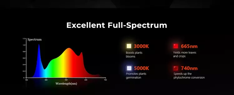 Das gesamte Spektrum an weißem, blauem, rotem und IR-Licht (3000 K, 5000 K, 660 nm und IR 760 nm) ist perfekt für alle Wachstumsstadien. 3000K-LEDs erzeugen ein rötlicheres Licht und 5000K-LEDs erzeugen ein bläulicheres Licht. Rotes und infrarotes Licht mit einer Wellenlänge von 660 nm sind während der Blüte besonders nützlich, da es die Blütezeit beschleunigt und den Ertrag steigert. Das Licht sieht natürlich aus und eignet sich daher für die genaue Überwachung der Pflanzengesundheit.