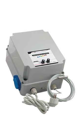 Ein charakteristisches Merkmal des Stufentransformator-Reglers ist, dass seine Lüfter bei niedrigeren Drehzahlen kein „brummendes“ Geräusch erzeugen. Der Stufentransformator regelt die Lüftergeschwindigkeit je nach Temperatur automatisch in 6 Stufen nach oben oder unten (sein Betrieb wird durch eine Anzeige aus bunten LED-Dioden angezeigt). Mit zwei Drehknöpfen wird die Hysterese (Empfindlichkeitstemperatur) eingestellt. Der Controller wird als fertiges Element geliefert und ist sofort einsatzbereit. Diese zuverlässige Lüftersteuerung verfügt über eine versiegelte wasserdichte Abdeckung, Flip-Flop-Kappen und einen Niederspannungssensor und ist somit ideal für den Einsatz in Nassräumen. Der Sensor wird mit einem vier Meter langen Kabel geliefert, das auf bis zu 50 Meter verlängert werden kann.
